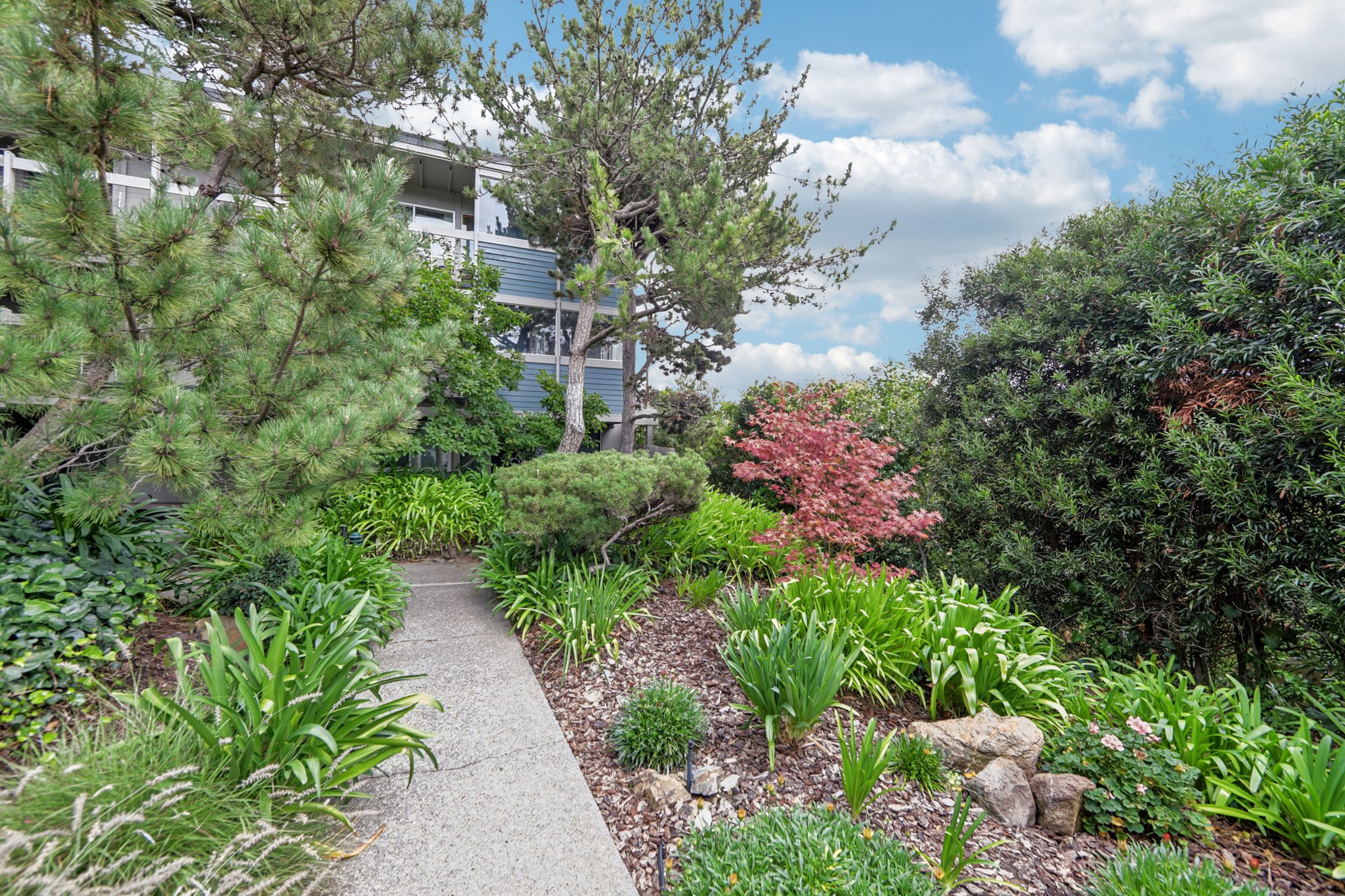 Three bedrooms and two baths comprise the private quarters of the unit. The primary suite has hill views, two large closets, one walk-in, and a remodeled en-suite bathroom with tub and iridescent tiles.